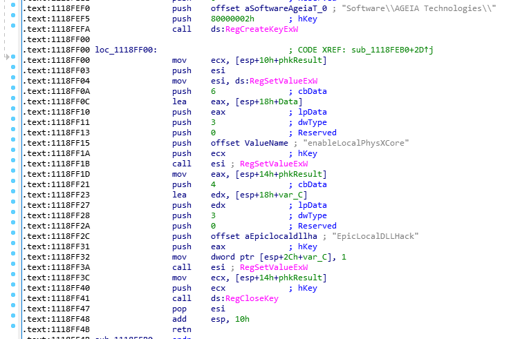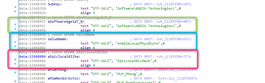 You can see above where enableLocalPhysXCore, EpicLocalDLLHack, and even the registry key path is defined, all right next to each other.
