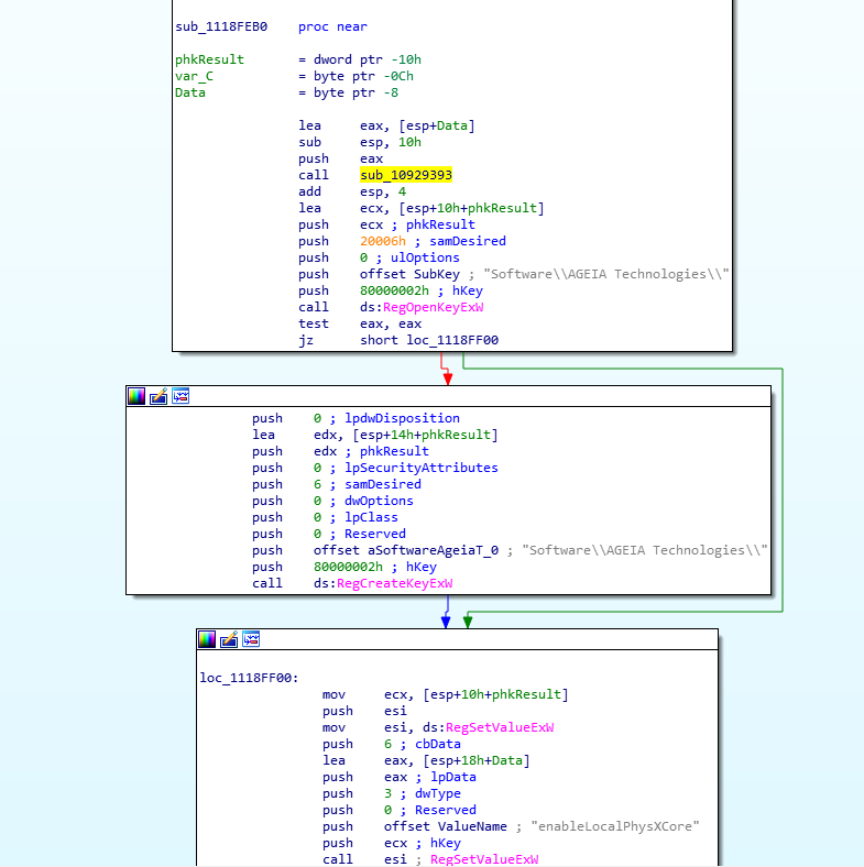 Looking at this, we can see it’s writing RegSetValueExW. I’m a very weak C developer, so after doing some googling, I can see that this is the stack being setup to invoke a method call from the Windows API in C, which you can somewhat see with the parameter name that IDA shows, such as lpData and dwType. We know that enableLocalPhysXCore’s value is set to your MAC address – lets see where that gets set. Let’s change to Graph View for a more logical look at this.