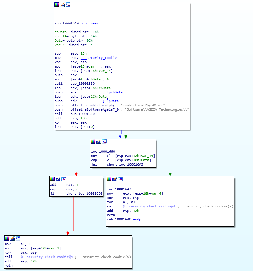 However, if we look at the references to this subroutine (there are two – likely one for each library) in IDA and Ghidra, we can see that ShouldUseLocalPhysX is being called, it’s checking if al is not zero. If it’s not zero, it loads the local PhysXCore.dll. If it is, it appears to look it up through the system PhysX installation, which is identified by another registry value in the AGEIA Technologies key named PhysXCore Path. We’re not really interested in that, since we’re looking to force PhysX to always load locally, regardless of the enableLocalPhysXCore being set or not.