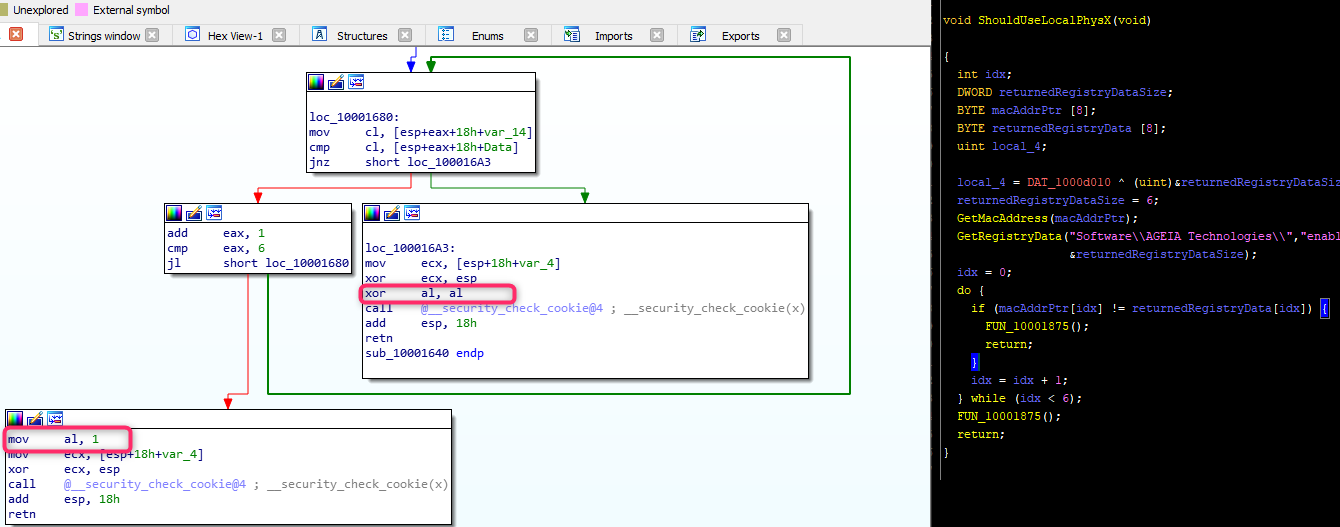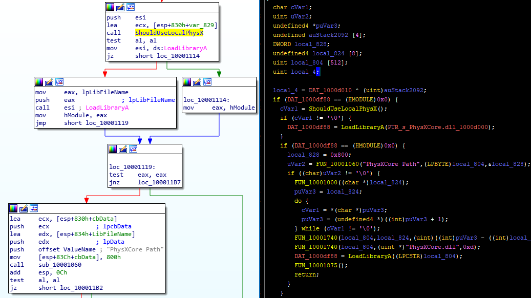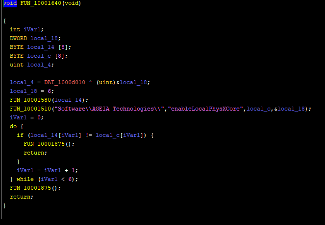 Now, this subroutine call seems to not do the actual loading – it is just checking for the key, and if the MAC address matches. Given the name and what we know about this key’s activity, we can give this subroutine an educated guess of a name of ‘ShouldUseLocalPhysX’. Comparing IDA and Ghidra’s decompilation of this subroutine however lead to slightly different results, with Ghidra’s seemingly being wrong: