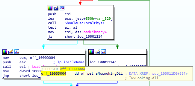 Looking at the other cross reference, we can indeed see it’s loading the NxCooking library, using ShouldUseLocalPhysX in the same way:
