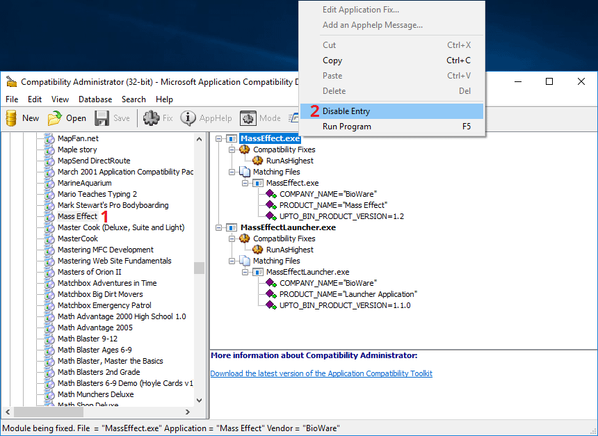 mirh (I’ve seen him in some of the modding circles) did some sleuthing to figure out why Mass Effect is being forced to run as administrator. It meets the criteria in the database – it specifically has an entry for Mass Effect – which has its own always-forced compatibility settings. It makes sense – users shouldn’t have to configure the settings if MS already knows ones that (technically) work.