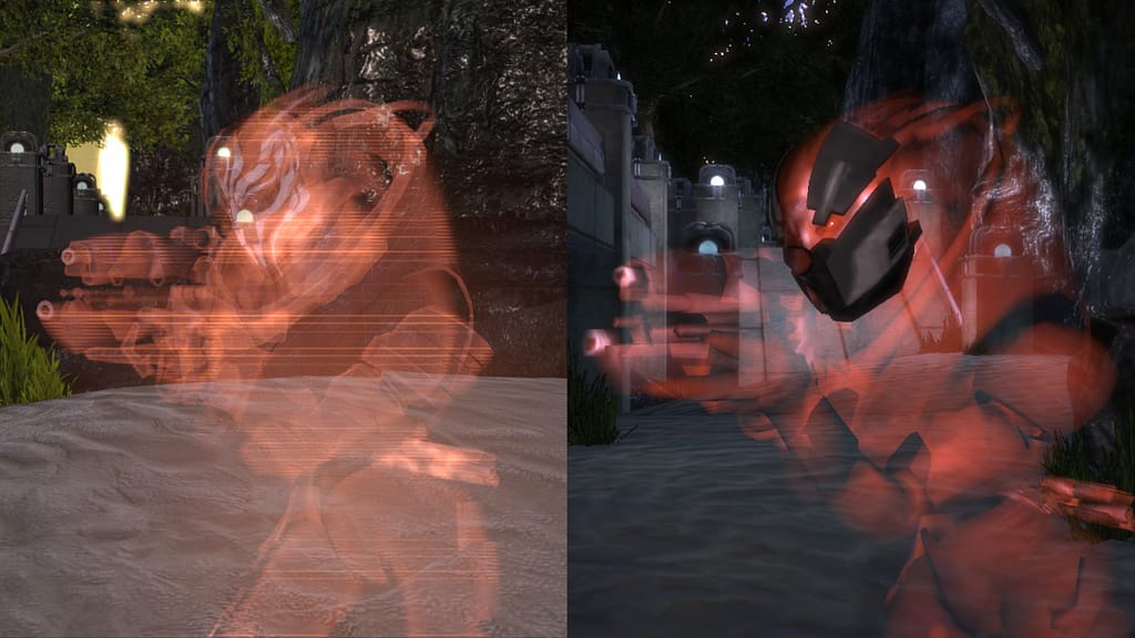 In the original game, the turian faceplate did not get the holo effect. HenBagle spent a lot of time getting it to be applied, which makes it much better looking when an enemy spawns. Due to the faceplate also being holographic, it is a bit hard to see in the left picture.