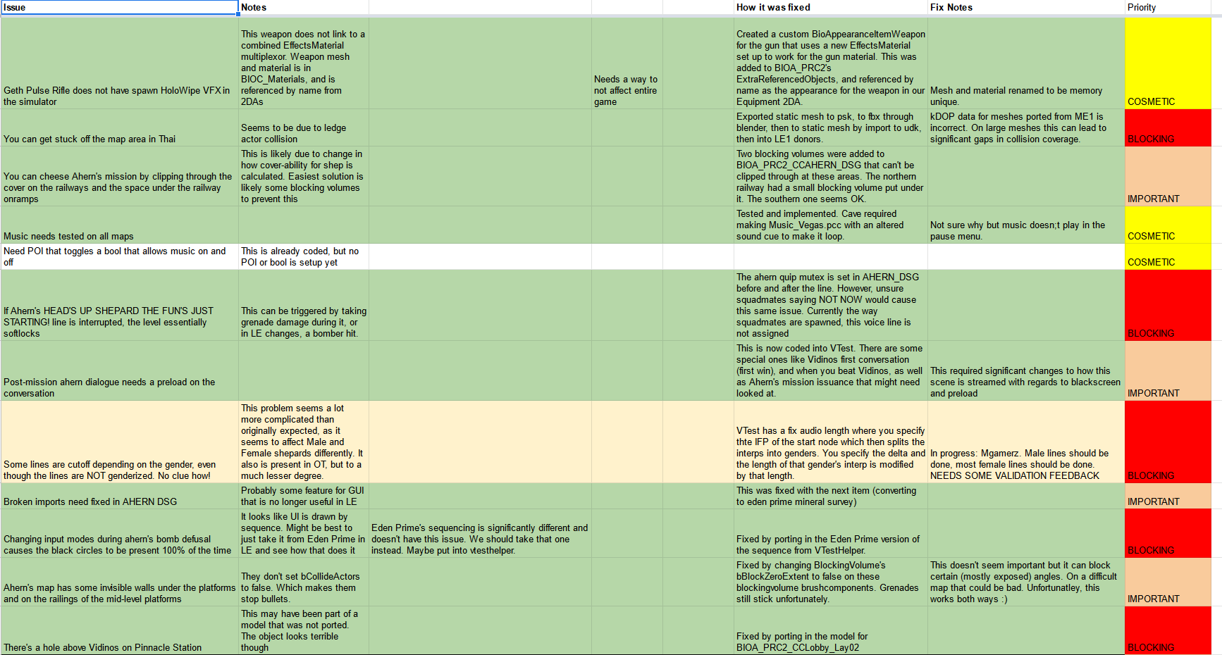 We used an excel sheet to track issues and how they were fixed, as well as other things such as donor materials. This project was not big enough to warrant using a larger system such as JIRA or GitHub issues. We would fill this out as we went along. As of initial release, most of them have been checked off, with a few being most to post-release.