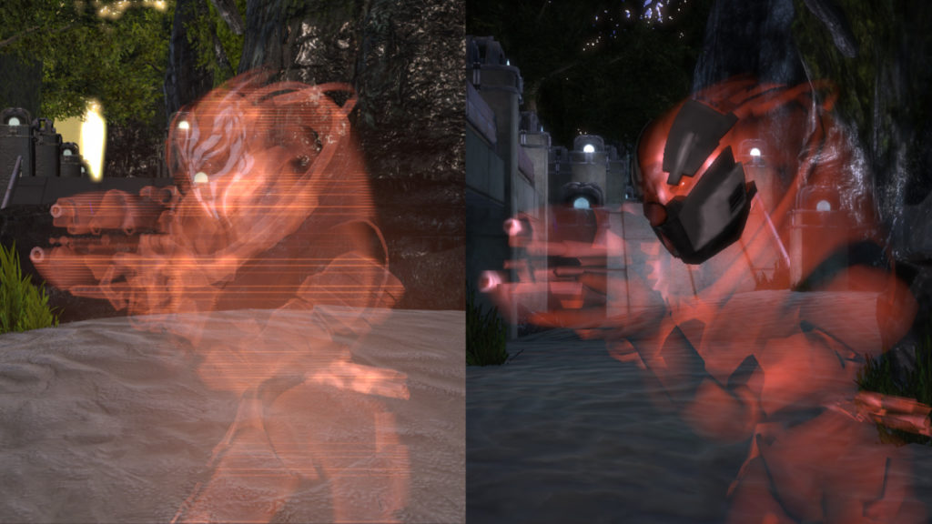 In the original game, the turian faceplate did not get the holo effect. HenBagle spent a lot of time getting it to be applied, which makes it much better looking when an enemy spawns. Due to the faceplate also being holographic, it is a bit hard to see in the left picture.