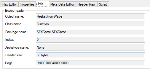 The above image is from the Info tab, which can also list if an export is a function. In this instance we have RestartFromWave. Using logic we can infer that this method probably takes a wave number, which it does.