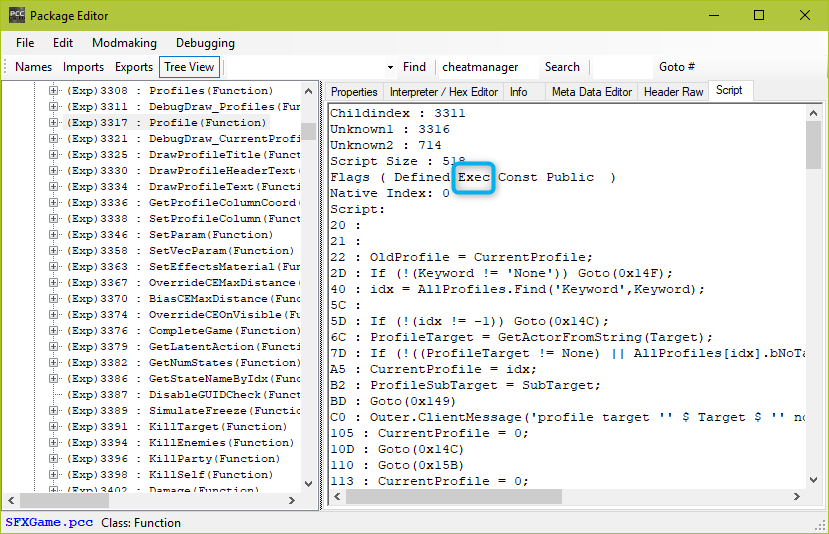 By identifying a "base" object, we can determine easier that that is a method. The other items that are above a "base" are typically variables in that function. In the above image, you can see an example "base" object/method on the left, and its variables above it. The above image is a valid method, and it's also a valid console command because it has the Exec flag. In this specific instance, this command takes a string and will list all variables the player has that contains the search string.