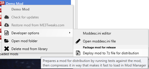 Once you've wrapped up your development of your DLC mod, it's time to deploy it. Deploying your mod with Mod Manager will still allow manual installations (the only extra file is moddesc.ini), but installing with Mod Manager is easier, and provides a lot of sanity checks for developers and users.