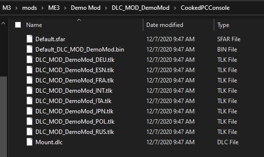 | Mount.dlc | Used by the game to determine what load order for DLC, when to load the DLC, what messages to display for the DLC, and more. You can edit Mount.dlc files in Mount Editor in ME3Explorer - ME3Tweaks Fork's Mount Editor. |