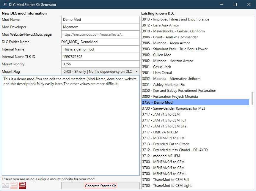 Starter kit will ask you to fill out some fields about your mod. Changing these values later is annoying, so make sure you choose your values wisely. For mount priority values, you should choose an unused value under 4800 (but greater than 3300) from information on the DLC mod telemetry database. It is vital that you pick an unused one as if you collide with another the game will have undefined behavior. For the TLK ID, you can for the most part pick a random (keyword, random) number between 1 billion and 2 billion.