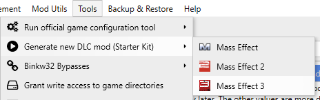For this tutorial we will be doing some SP modding, so we will be using a Custom DLC. To start using Starter Kit, go to Tools > Mod Development > Generate new DLC mod (Starter Kit) > Select your game. For this tutorial we will be doing Mass Effect 3.
