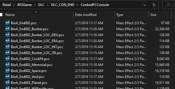 Mass Effect 3 DLC is similar, but instead of individual files being compressed, files are essentially zipped up in a proprietary archive format, called SFAR. This is backwards for RAFS, or Random Access File System. This isn't the official name, as there is no stated one, but it makes sense given what the archive file does for the game. For the remainder of this guide (and in the modding scene) they are referred to as SFAR. You can find technical information on this file format on the ME3Explorer Wiki page for SFAR. SFAR files in the DLC directory are always named Default.sfar, while the TESTPATCH one is Patch_001.sfar. I talk about TESTPATCH in the TESTPATCH reference guide.