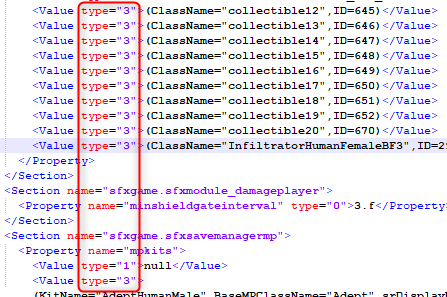 These types are fairly close to standard Unreal Engine 3's configuration file declaration, with the only noticable change being that ME3 has Clear and Assign or override, and UE3 has Remove (by propertyname) without a match.