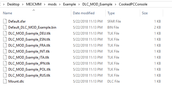 | Default_[DLC Foldername].bin | Coalesced file for your mod. Even if there is nothing useful in it, this file must exist. Starter kit includes blank versions of every main config file so you don't need to manually add them. |