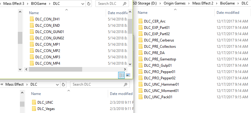 DLC for Mass Effect games are stored in different ways for each game. For Mass Effect and Mass Effect 2, DLC is simply another directory in the game, /DLC and /BioGame/DLC respectively. Under each folder is essentially the same folder structure as the basegame, with CookedPC(Console) and the like.