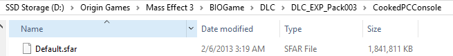 | Default.sfar | The game will always look for this file, always. A properly unpacked SFAR is 32 bytes in size, however ME3Explorer 3.0 unpacked SFARs of official DLC are not properly unpacked and are the wrong size. |