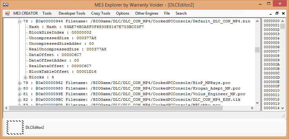 To extract files from .sfar file we will be using the DLCEditor tool from ME3Explorer. In recent versions there is a DLCEditor2 tool which seems to have less bugs at the cost of less UI. In this tutorial we will be modifying MP4, Retaliation. Retaliation added a lot of new items and overwrote many old ones so it is one of the most modified DLC in all of my DLC mods.
