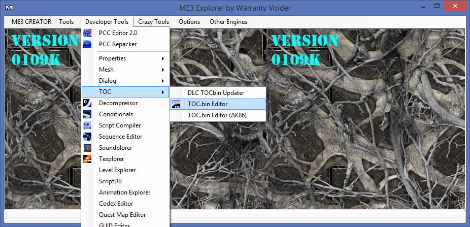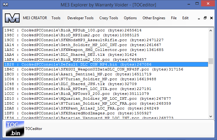 Every DLC has a PCConsoleTOC.bin file which must be modified if you modify game files and they become larger than the original. The basegame has a PCConsoleTOC.bin but it appears to be ignored. This file contains the sizes of all files that need to be loaded so that the engine knows how much memory to allocate. If the value is not large enough, the game will crash when it tries to load data into space it has not allocated. Since Gibbed's Coalesced compilers do not compress as efficiently as BioWare's, even no changes to the vanilla file will result in a larger one than the original. We use a tool called TOCEditor to fix this.