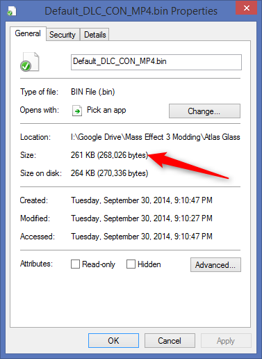Select Edit, and then choose Edit Filesize. Now you will need to know the exact filesize (or at least, larger, but I prefer exact) in bytes of your modified files (excluding PCConsoleTOC.bin). To find this, navigate to your modified file using Windows Explorer (the file browser) and right click on your modified file (in this case, Default_DLC_CON_MP4.bin) and select Properties. The value you need to use is Size (not size on disk). Use this value in the ME3Explorer dialog box that asks for the size.