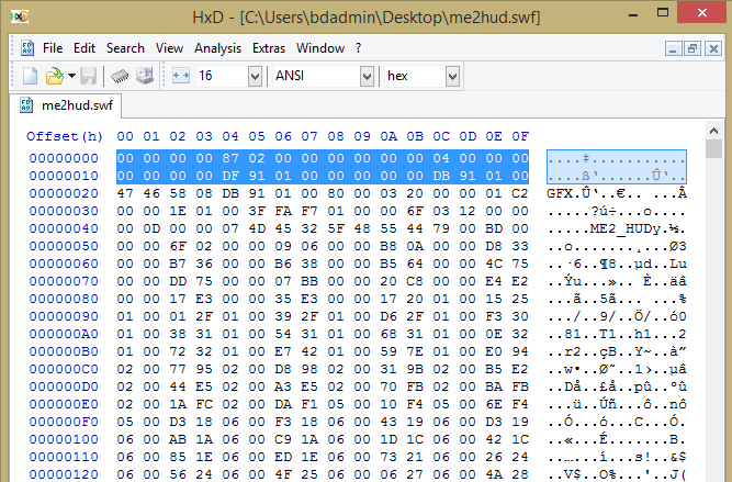 At this point, rename the .bin file you saved earlier as a .swf file, and open it in HxD. We will need to tweak this file a bit.