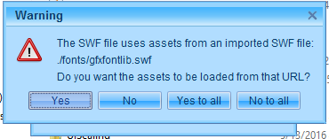 When opening our extracted SWF files we will almost always be presented with the dialog shown above. SWFs can reference other SWF for resources, in this case it is referencing gfxfontlib, which contains fonts used to draw text. These typically aren't useful to load since we can't actually preview anything in JPEXs for this game's SWFs, so most times you can hit No to all. In some instances it may be useful to say yes (assuming you have the specified file at the listed location to load) as it will resolve a few variable names.