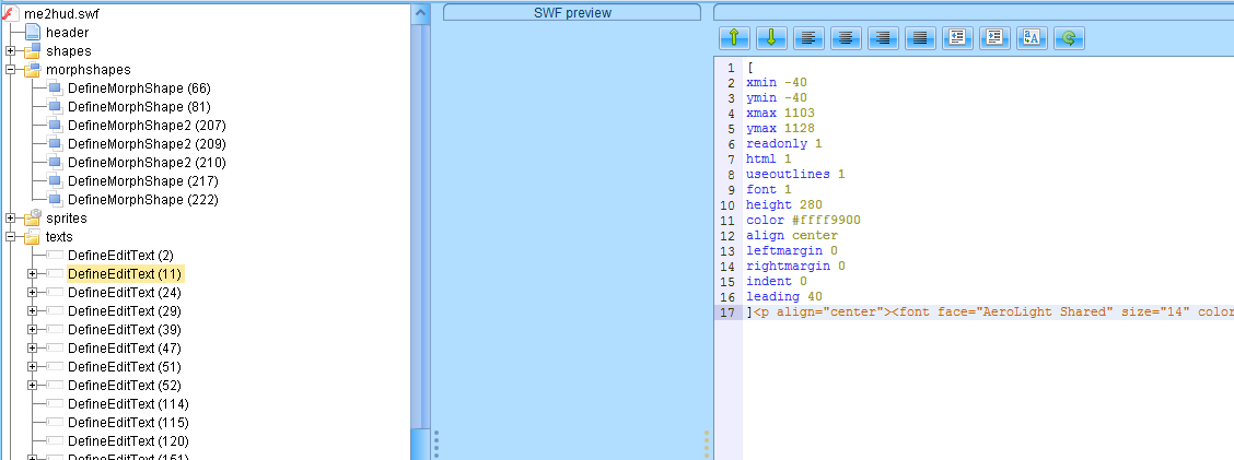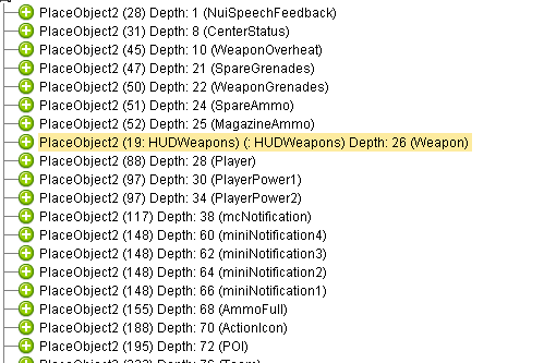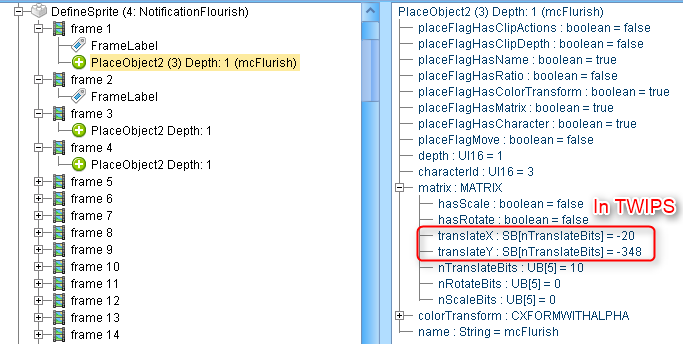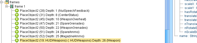 Frames, as a category of the SWF, control the placement of sprites, shapes, morphshapes, and text on the stage itself. As sprites can also contain these, you may need to drill through a few objects to find what you are looking for. For the most part, to change placement of UI elements, you will need to do so here. The biggest difficulty of changing element positioning on screen is the fact that it takes a lot of time. For every change you will need to boot the game and view it to make sure it is what you want.