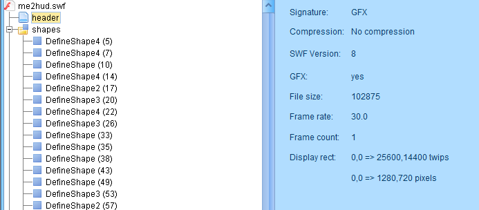 The header of the SWF file indicates thing such as compression type (Mass Effect 3's are not compressed, while Mass Effect 1's are), SWF file spec of the file (in this instance Flash Player 8), frame rate, the stage size, and other basic information.