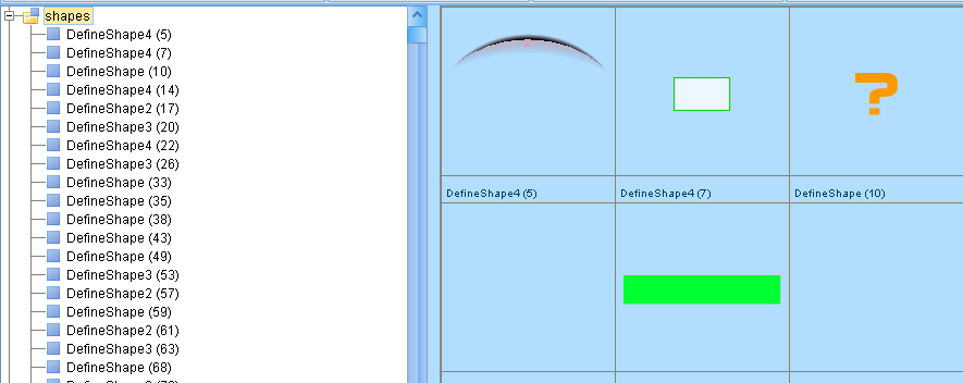 Shapes are scalable objects in flash player files. They are simple, as they cannot have a timeline, they don't respond to input events, and they can't be grouped into a cluster to form a more complex object. On the right side you can see some of the embedded shapes. Some of them are blank because they are contained in the pcc file as a texture, and externally referenced (which doesn't work in JPEXs and never will).