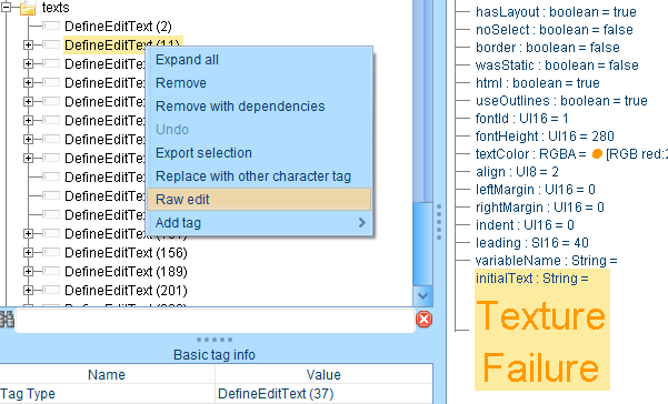 On the right side of the above screenshot you probably are noticing some HTML - flash player can render limited HTML text, which gives us some decent flexibility with what we can do with a text object. However, you cannot simply just click edit here and edit away - it won't be able to save (cannot find the font). Instead, you will need to go into Raw Edit, which is done via right clicking: