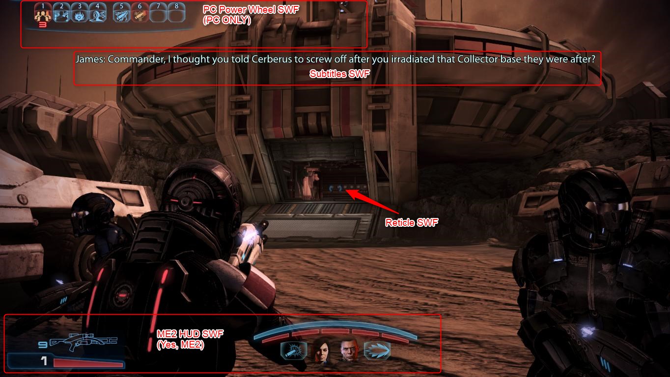 You by now have probably noticed that many of these interface files are called ME2 - not ME3. Almost all of the main HUD was simply a light update of Mass Effect 2's interfaces. A couple of recolors, maybe a slight change in how something works, and eventually the game was so far along refactoring it would have been more work than it was worth. Interestingly due to this, there is some leftover data, such as Mass Effect 2 style healthbars still in the game (if they can be used properly is another question).