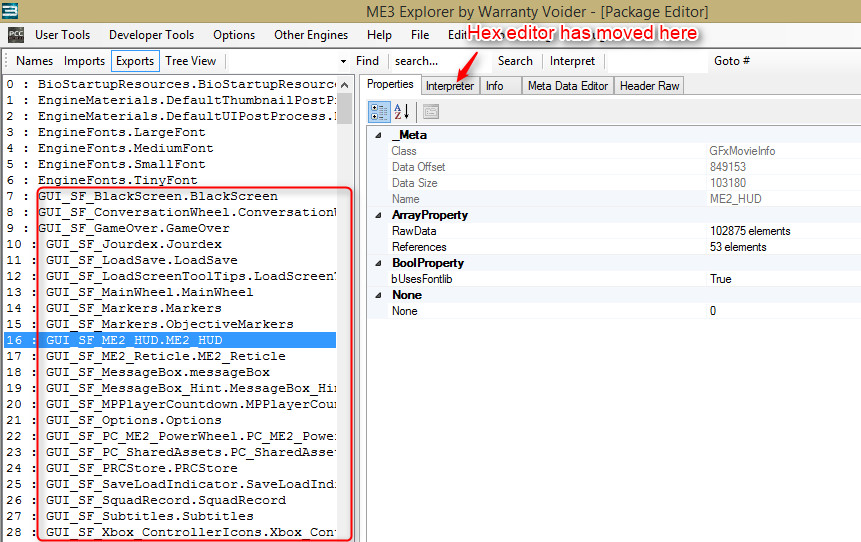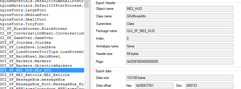 ME3Explorer has pretty good support has good support for viewing the PCC package format. We can view a list of exports, their hex data, properties, etc. For this, we will be finding GUI files, which have a class of GfxMovieInfo in Mass Effect 3 and BioSWF for Mass Effect. I am not sure what it is in Mass Effect 2.