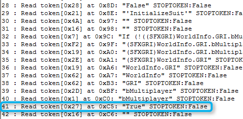 As you can see by this debug print, it has read in order the names of variables and values from the bytecode. You can find where something is by matching the variables near something in the decompiled script (top part) to the debug output of the lexer (bottom part). Bytecode is composed of tokens, which are like "symbols". They tell you what exactly to do. It is a "middle" state between native code (machine instructions) and source code (e.g. Atlas.turnLeft(50)), which has to be fully read and then parsed. This is how Unreal Engine makes games work on consoles, it compiles to bytecode, and then each platform (PC, PS3, etc) has its own native bytecode reader that makes it run on that platform.