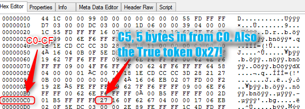 These tokens are defined as bytes. On line 41 you can see token 0x27 was read, which stands for "True". If you look up at line 28 you can see 0x28 is "False", so we are going to change a 0x27 to a 0x28. Where? At 0xC5 of course, as it says on line 41. Change to the hex editor tab.