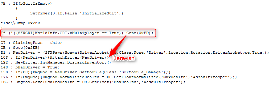 This is an if statement where the Global Replication Info (GRI) is checked to see if it is multiplayer, which it is. The ! at the start is a not, so if it is not multiplayer, jump to 0xFD, which is a hex address offset, which goes past a few lines of code. So essentially, if it is singleplayer, skip the next two or three lines. Additionally at CE we have another Goto/Jump statement, down to 0x2EB. This is beyond all of the driver initialization part where an assault trooper is loaded and assigned health and such.