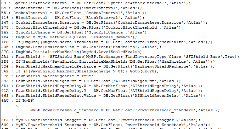 This shows it reading information from the Biodifficulty.ini file. For example, on the 1F8 line, it is getting the floating point number from "MaxHealth" under the heading "Atlas". This also shows how shields are added to an enemy - I've had requests to add shields to husks and such. Adding them to biodifficulty does nothing because the script doesn't bother to load it. Since we don't have a compiler for pcc files, we likely never will be able to add them (perhaps if you redirected this function to your own it would work, but that's far beyond my knowledge).