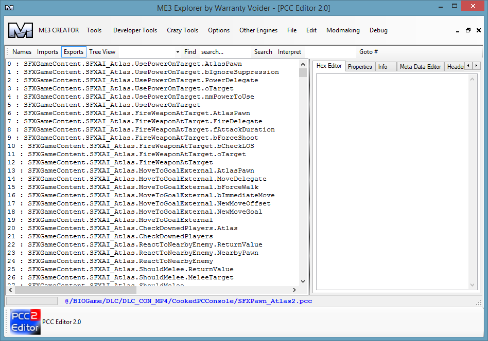 You might have asked up above, "Atlas2"? Bioware added a DoT rocket to the Atlas in Retaliation, which made them replace the original Atlas with Atlas2. It is named SFXPawn_Atlas2, where the original was just SFXPawn_Atlas. So we need to load Atlas2 from MP4, so we open ME3Explorer and choose PCCEditor2.