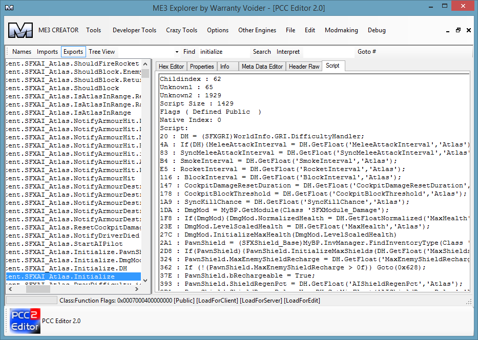 Our target lies in another script however, named SetInitialState. Search for that and you should be at 988, SFXGameContent.SFXPawn_Atlas.SetInitialState. In the script tab you should see a fairly long script, but it contains a key piece of code in it that makes the Atlas different in MP than it is in SP.