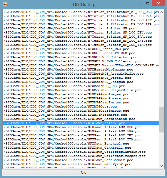 From here we must navigate to the Default.sfar for MP4. It is in your Origin Games folder, under Mass Effect 3\BIOGame\DLC\DLC_CON_MP4\CookedPCConsole. Open the Default.sfar file. Once you do this, a new window will popup. You might need to expand it so you can read all the entries. Scroll down a ways and find SFXPawn_Atlas2.pcc. The list is alphabetical. Do not choose the LOC ones.