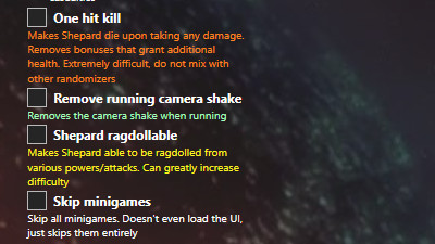 Randomization not your fancy? ME2R includes several non-randomizer features such as removing the running screenshake, removing mini games, one-hit kill mode and more.