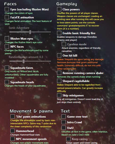 Below is just a sample of some of the randomizers included in Mass Effect 2 Randomizer (ME2R).