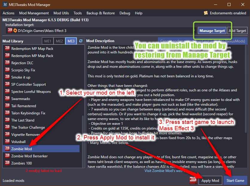 Installing a mod is as simple as selecting a mod on the left side of Mod Manager and clicking Install Mod.